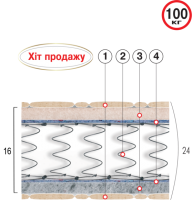 Двусторонний пружинный матрас Адмирал с эффектом «зима-лето» из серии «Люкс» от производителя Велам1. Чехол стеганый на застежке «молния» с 3-х сторон, ткань - жаккард хлопковый (1)*2. Материал нетканый «Sprut» с волокнами хлопка (3)3. Жесткий настил «Thermofelt» (4)4. Пружинный блок «Bonnel» (2)5. Жесткий настил «Thermofelt» (4)6. Материал нетканый «Sprut» с волокнами шерсти (3)7. Чехол стеганый, ткань - жаккард хлопковый (1)Высота матраса: 24 смНагрузка: 100 кгЖесткость: среднемягкийРазмеры: 80(90,120,140,160,180)*190(200) см* Цифры в скобках соответствуют обозначениям на фото